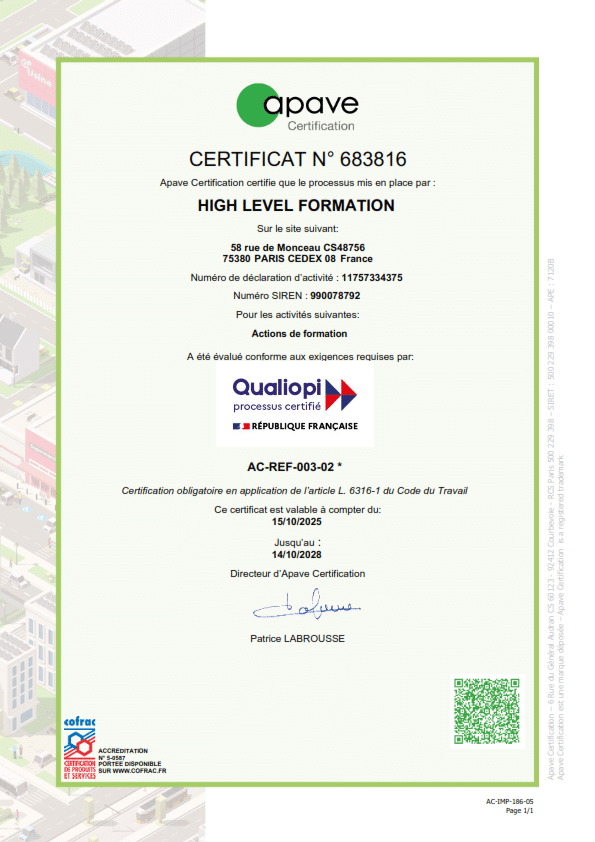 L’inscription se fait après validation d’un devis, en contactant directement l’organisme à l’adresse suivante : contact@high-level-formation.fr. Un délai d’environ 10 à 30 jours est nécessaire pour organiser la session.